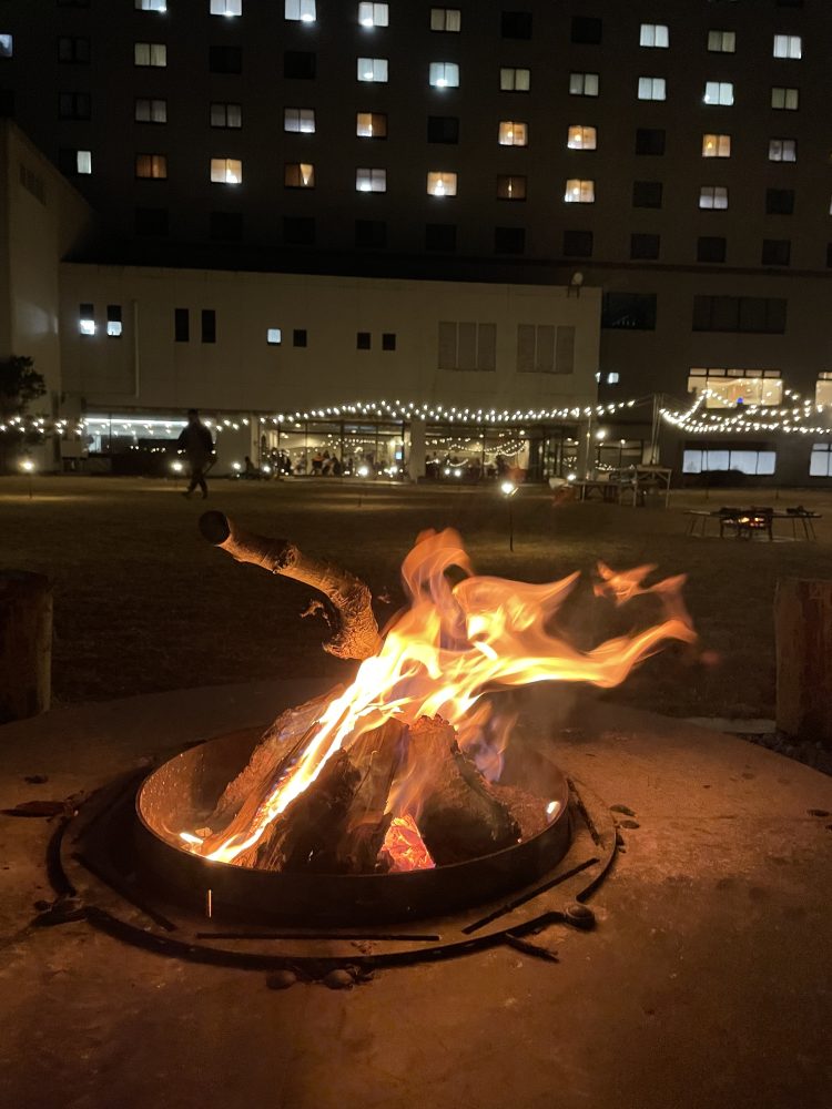 눈에 싸인 안뜰에서는 겨울의 밤을 즐기는 특별 이벤트로서 모닥불을 둘러싼 야키 마슈마로 체험을 개최하고 있습니다.