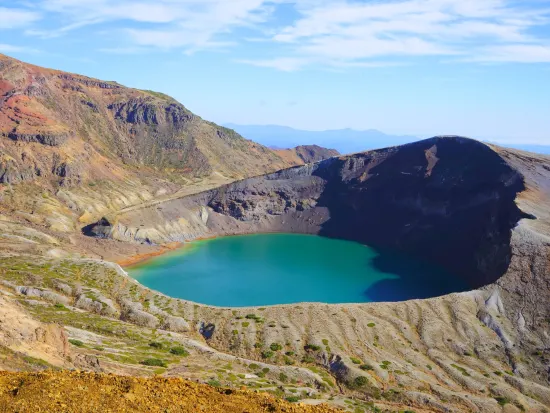 御釜は蔵王刈田岳・熊野岳・五色岳の3峰に抱かれた円型の火口湖。ホテル目の前のエコーラインを車で約40分の所にあります。荒らしい火口壁と対比して神秘的な雰囲気があり宮城蔵王の一番の観光名所。
